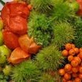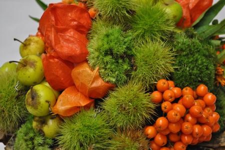 •  Faire une premiere ligne avec les cosses de chataigne que vous maintiendrez avec des agrafes florales. Continuez cette technique avec les autres éléments par groupes en faisant des lignes courbées.
