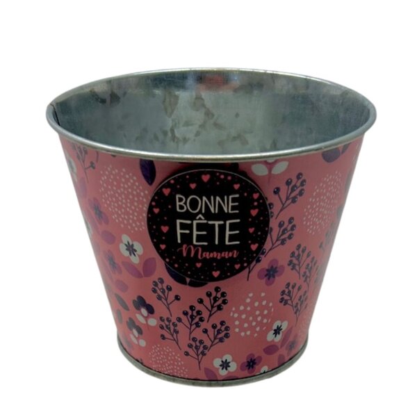 Magnifique contenant en zinc. Décoration extérieur rose, avec petites fleurs, et magnet "Bonne fête maman" apposé sur le devant..